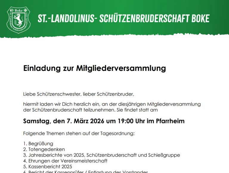 Neuigkeiten Einladung Jahreshauptversammlung Einladung zur Mitgliederversammlung Liebe Schützenschwester, lieber Schützenbruder, hiermit laden Mehr Lesen »