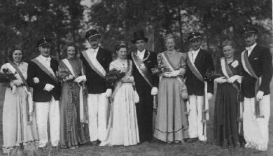 Martin Berhorst und Anneliese Wilper mit Hofstaat bei dem ersten Schützenfest nach dem Zweiten Weltkrieg, 1949
